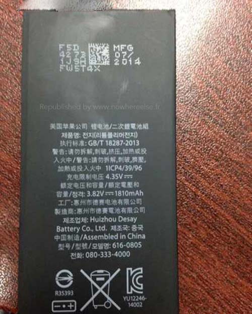 該條消息由法國(guó)媒體曝出,其表示樣張?jiān)醋詉Phone 6的電池諜照拍攝于生產(chǎn)線。得益于不錯(cuò)的照片質(zhì)量,我們收集到了更多的有用信息。目前來(lái)看,iPhone 6電池容量為1810mAh(3.82V),制造商為惠州市德賽電池有限公司,和iPhone 5S的電池供應(yīng)商一致。