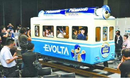 日本松下公司14日展示以干電池為動(dòng)力的電車。該電車由特殊的硬紙板制成,將于11月試運(yùn)行,以99節(jié)1號電池為動(dòng)力,可搭載10人行駛8公里。