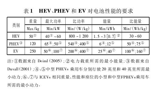 由于不同類型新能源汽車中,車用動(dòng)力電池的使用方式有較大區(qū)別,因此對(duì)于其性能要求有較大區(qū)別。HEV有汽油發(fā)動(dòng)機(jī)作為動(dòng)力來(lái)源,更強(qiáng)調(diào)加速性能和爬坡能力,因此更注重電池的比功率(要求高達(dá)800一1 200 W / kg);PHEV和EV完全以電池作為動(dòng)力,更強(qiáng)調(diào)充電后的續(xù)駛能力,因而更關(guān)注電池的比能量(要求達(dá)到100一160 Wh/kg)(見(jiàn)表1)。