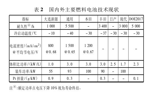 目前,國(guó)內(nèi)外燃料電池的技術(shù)現(xiàn)狀見(jiàn)表2。