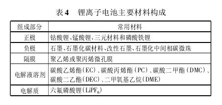 鏗離子動(dòng)力電池主要由正極材料、負(fù)極材料、電解液和電池隔膜4部分組成(見表4)。
