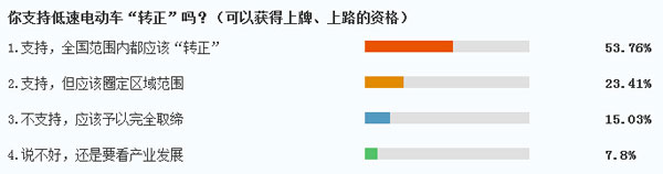 對(duì)于這一爭(zhēng)議話題,參與調(diào)查的77.17%的網(wǎng)友都對(duì)于低速電動(dòng)車“轉(zhuǎn)正”表示了支持,其中53.76%的網(wǎng)友更是認(rèn)為應(yīng)該在全國(guó)范圍內(nèi)將低速電動(dòng)車“扶正”,充分滿足市場(chǎng)的需求。