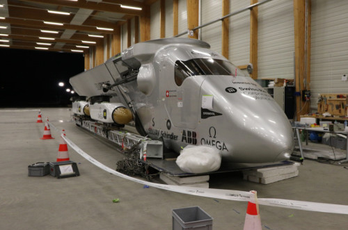 中國媒體瑞士考察團一行人到達位于陽光動力公司所在地瑞士洛桑附近的巴亞尼(Payerne)機場時,陽光動力2號已經(jīng)被拆解開來,72米長的機翼被拆分為三部分,多名工作人員正利用機械裝置將其裝進一架波音747貨機,駕駛艙和尾翼仍在機庫中,其他零件則已經(jīng)裝箱并進行標注。這架貨機周二早晨將裝載著陽光動力2號的零件飛往阿布扎比,預計當天下午到達。