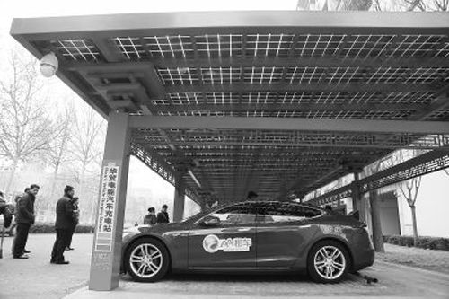北京市華貿(mào)中心東側(cè)的停車(chē)場(chǎng)里,掛著“華貿(mào)電能汽車(chē)充電站”的招牌,一個(gè)縮小版的世博會(huì)“中國(guó)館”在過(guò)去一個(gè)月里悄然完成。紅色窗欞的映照下,6臺(tái)一米來(lái)高的綠色充電樁一字排開(kāi),不過(guò)和尋常屋頂上的磚瓦結(jié)構(gòu)不同,這座小館的整個(gè)屋頂全部是由一片片20多厘米長(zhǎng)寬的太陽(yáng)能光伏發(fā)電板拼接而成。這座北京市首個(gè)太陽(yáng)能光伏公共充電站于1月5日開(kāi)始試營(yíng)運(yùn),新能源車(chē)主們終于在核心城區(qū)有了大型公共充電站。