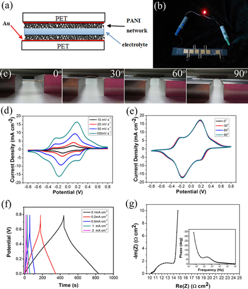 聚苯胺是一種具有特殊的電學(xué)、光學(xué)性質(zhì),且經(jīng)摻雜后可具有導(dǎo)電性的高分子化合物,其在電子工業(yè)、信息工程、國防工程等的開發(fā)和發(fā)展方面都具有多種用途。通過一系列實驗,該課題組研究人員利用原位電沉積技術(shù)在柔性導(dǎo)電基底上均勻地制備了一層聚苯胺薄膜,并以此作為復(fù)合電極進(jìn)一步制備了柔性超級電容器。這種超級電容器具有51.7 mF cm-2最大面電容,以及5.57 mWh cm-3最大能量密度,其并聯(lián)后可以有效地驅(qū)動LED燈數(shù)分鐘,并且展現(xiàn)出優(yōu)異的柔韌性和循環(huán)穩(wěn)定性(圖1)。