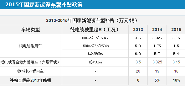 2015年,我國新能源車的國家補(bǔ)貼金額將比去年進(jìn)一步減少。根據(jù)2014年2月8日國家發(fā)改委等部門聯(lián)合發(fā)布的《關(guān)于進(jìn)一步做好新能源汽車推廣應(yīng)用工作的通知》,2015年的補(bǔ)貼金額相比2013年將降低10%。