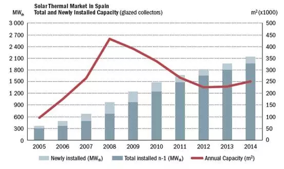 在連續(xù)四年的市場衰退之后,西班牙光熱市場終于進(jìn)入了穩(wěn)定發(fā)展期。2014年底,西班牙集中式光熱發(fā)電裝機(jī)共計(jì)2.24 GWth,全年平均增速9%。