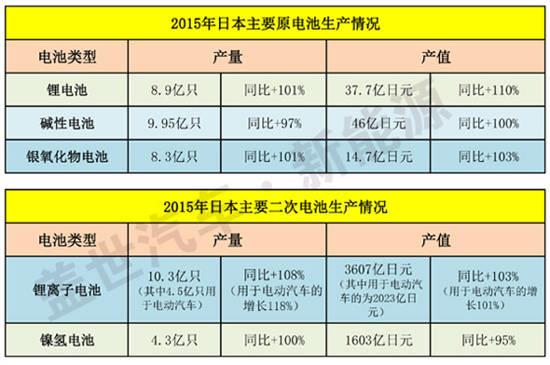 2015年1-12月,日本電池(包括原電池和二次電池)總產(chǎn)量超過43億只,總產(chǎn)值逾8075億日元(約463億元人民幣),產(chǎn)量和產(chǎn)值與上年同期相比均實(shí)現(xiàn)101%的增長幅度。